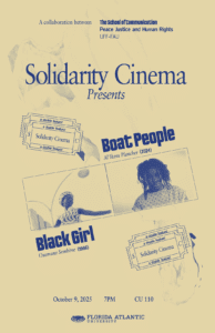 Given the centrality of immigration in recent news and South Florida serving as a hub for various immigrant communities, we will be screening Boat People (2024), a short form fiction film about Haitian refugees who were held in Guantanamo Bay in the 1990s, and Black Girl (1966), the first Black independent Senegalese film that follows a Senegalese woman who moves to France to work for a wealthy family. Al’lkens Plancher, the director of Boat People, and Renata Bozzetto, Deputy Director of the Florida Immigrant Rights Coalition, will join us in a post-screening discussion.