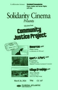 The next Solidarity Cinema Series screening will be on March 26 at 7 PM in CU 107 in our campus movie theaters. Community Justice Project will be traveling up from Miami to show a selection of films in their series where they team up filmmakers with local community organizers.